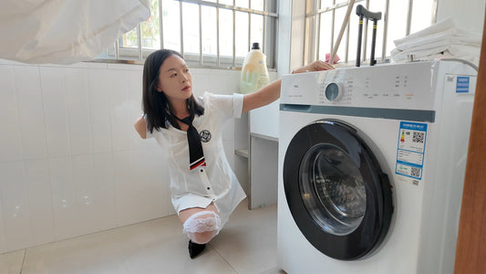 Beibei: OOE Amputee Girl gets up early to wear a prosthetic leg and go down the stairs